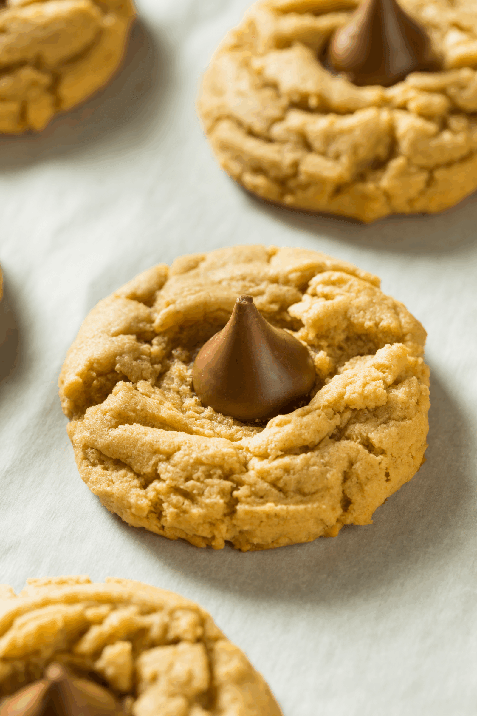 - Peanut Butter Kisses: A nostalgic favorite. We make these classic peanut butter cookies with a soft, crinkly texture and press a milk chocolate kiss right into the center while they’re still warm.